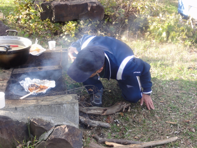 我々が芋煮食べ、パークゴルフしてる間も、火のそばを離れない兄!
