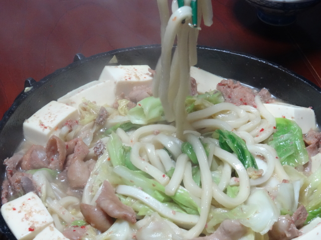今夜は久しぶりに秋田のホルモン鍋。キャベツ、豆腐、うどんが定番。