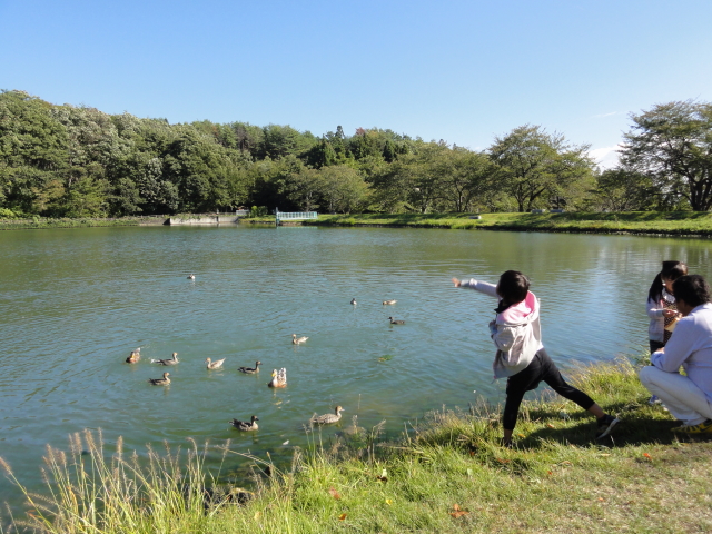 食事して散歩してると、スワン公園で、親子がかもに、パンをあげてました。