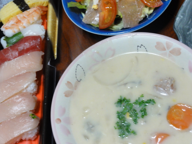 牡蠣食いたい夫の要望で、牡蠣入りシチュウと、お寿司、生ハムのサラダでかんぱ~い!
