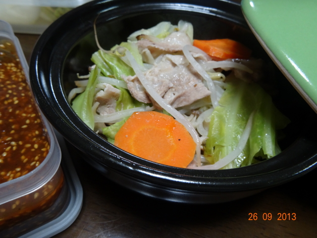 ハードオフで求めた蒸し鍋!キャベツ、人参、もやし、豚バラ肉、しめじなど。