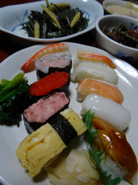 ヤマザワの500円寿司と、アザミとうどの煮物。