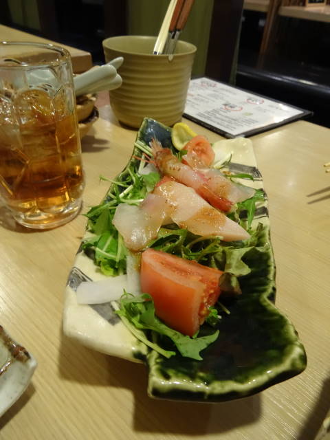 居酒屋「ごっつお」にてカルパッチョのうまいこと。ソフトドリンクで乾杯!