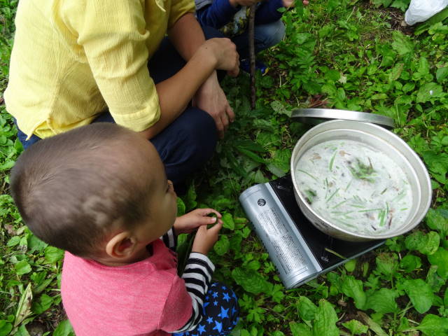 採ったみず、去年のきのこ、鯖缶、麸、みそ持ち寄って、、、