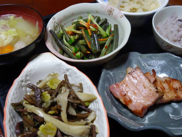 山菜と生姜入り豚汁、古代米で、、、健康食。