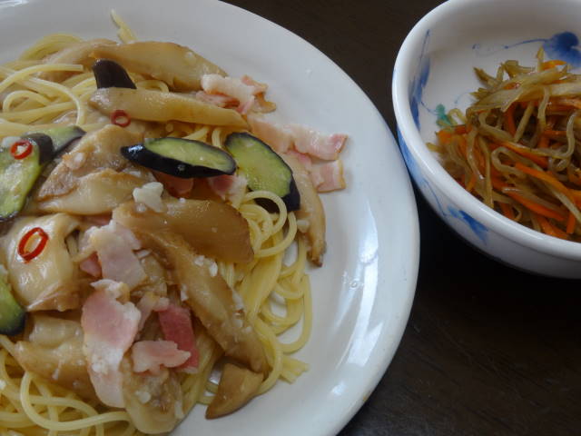 ムキタケはパスタに入れると、絶品です。にんにく、ベーコンと一緒に塩コショウ味で、、、鷹の爪は少し。
