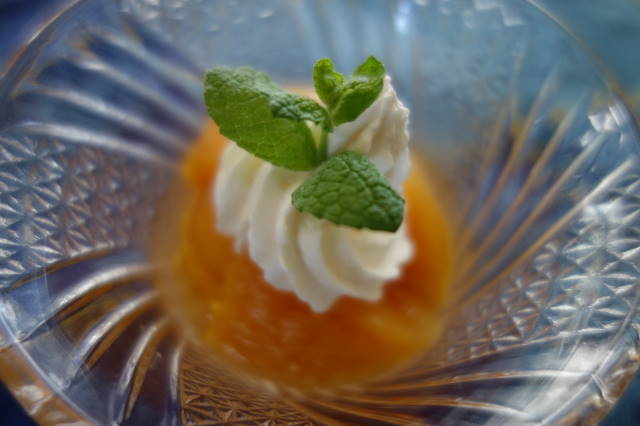 黄桃のコンポートをつくりました。庭のアップルミントを。。